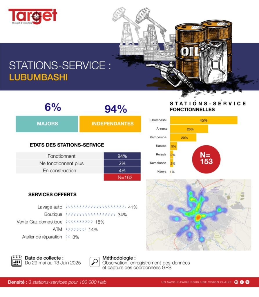 L’enquête Target révèle que 94% des stations-service à Lubumbashi sont gérées par des indépendants, contre seulement 6% de majors. Avec 94% des stations fonctionnelles sur les 162 répertoriées, la ville démontre une résilience logistique. Le commerce (Boutique 34%) et le lavage auto (41%) dominent les services annexes offerts. Ce tissu indépendant est le moteur de l’économie locale.