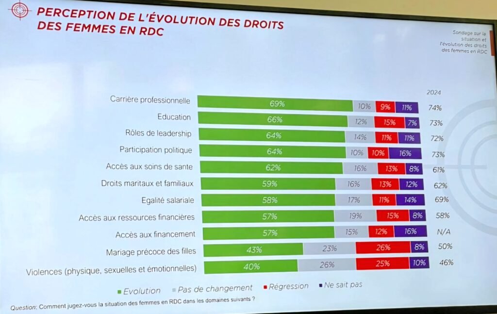 Ce lundi 09 mars 2026, Target Sarl a dévoilé une étude alarmante révélant une chute brutale de l’optimisme sur les droits des femmes en RDC. Entre 2024 et 2026, l’adhésion aux progrès réalisés a dégringolé de dix points, traduisant un sentiment de stagnation face aux violences persistantes et aux inégalités profondes.