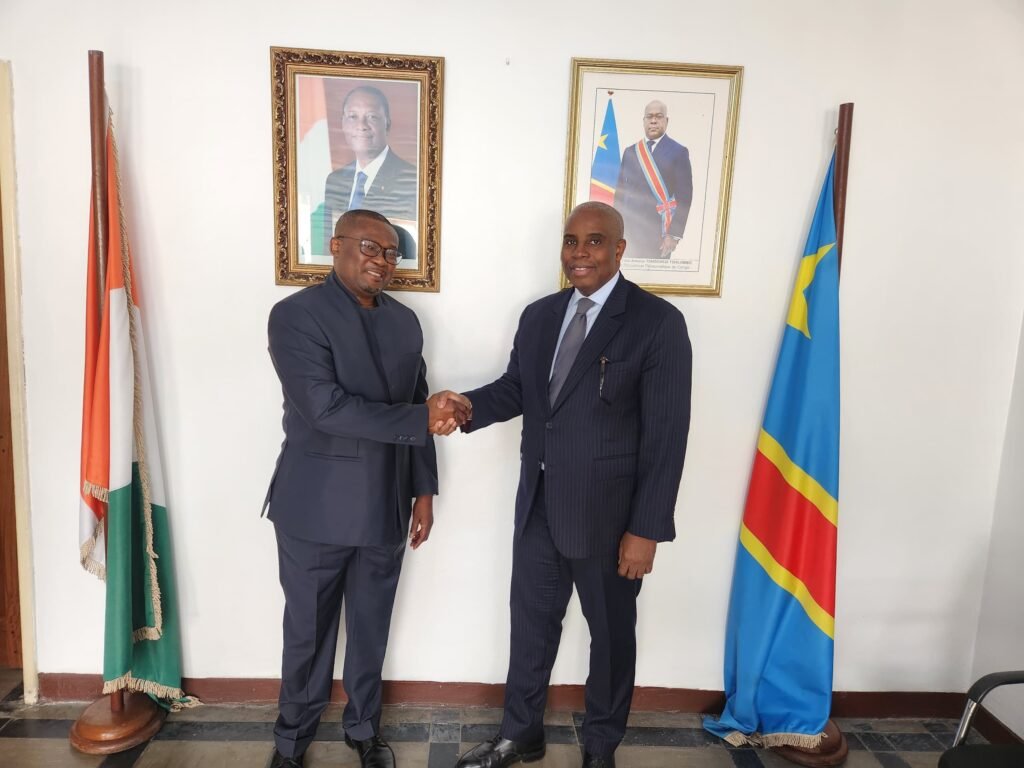 La diplomatie économique est en marche. À 11h00 ce mercredi, le Directeur Général de l’APROCM, Pascal Tchelo, accompagné de sa délégation, a été reçu à l’Ambassade de la Côte d’Ivoire à Kinshasa. L’objet : une « prise de contact » qui s’est rapidement transformée en une séance de travail riche en perspectives. L’Ambassadeur ivoirien a d’emblée affiché son enthousiasme, ouvrant la voie à des échanges constructifs.